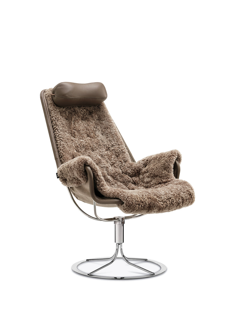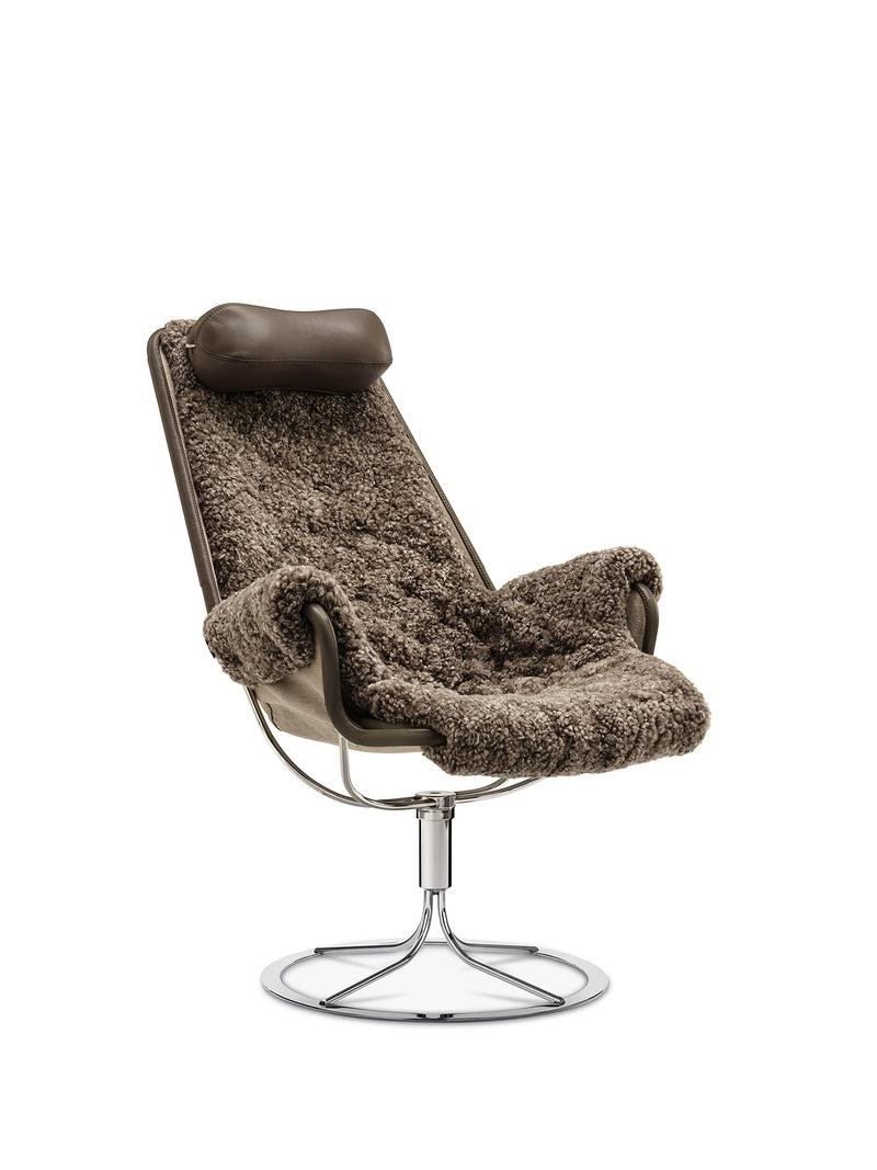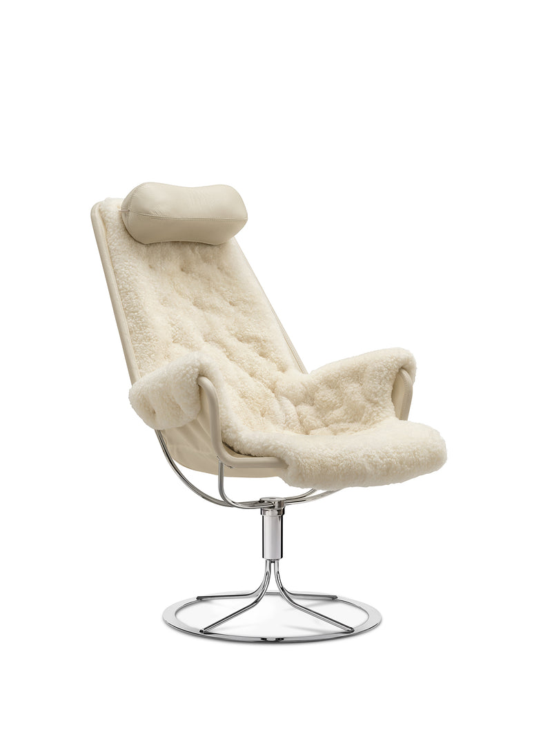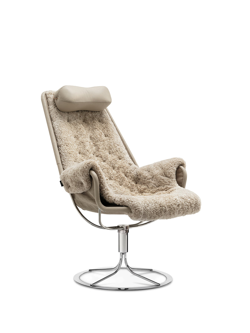 Ikonisk lenestol designet av Bruno Mathsson. Jetson-stolen gjenspeiler både hans lidenskap for komfort og en klassisk svensk, moderne designtilnærming. Den har et skålformet sete og ergonomisk utformet høy rygg med hodepute. Svingbar fot i krom med unik returmekanisme.