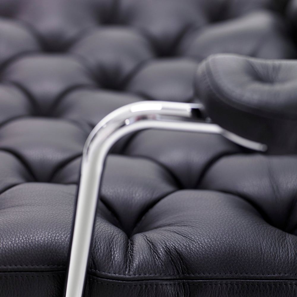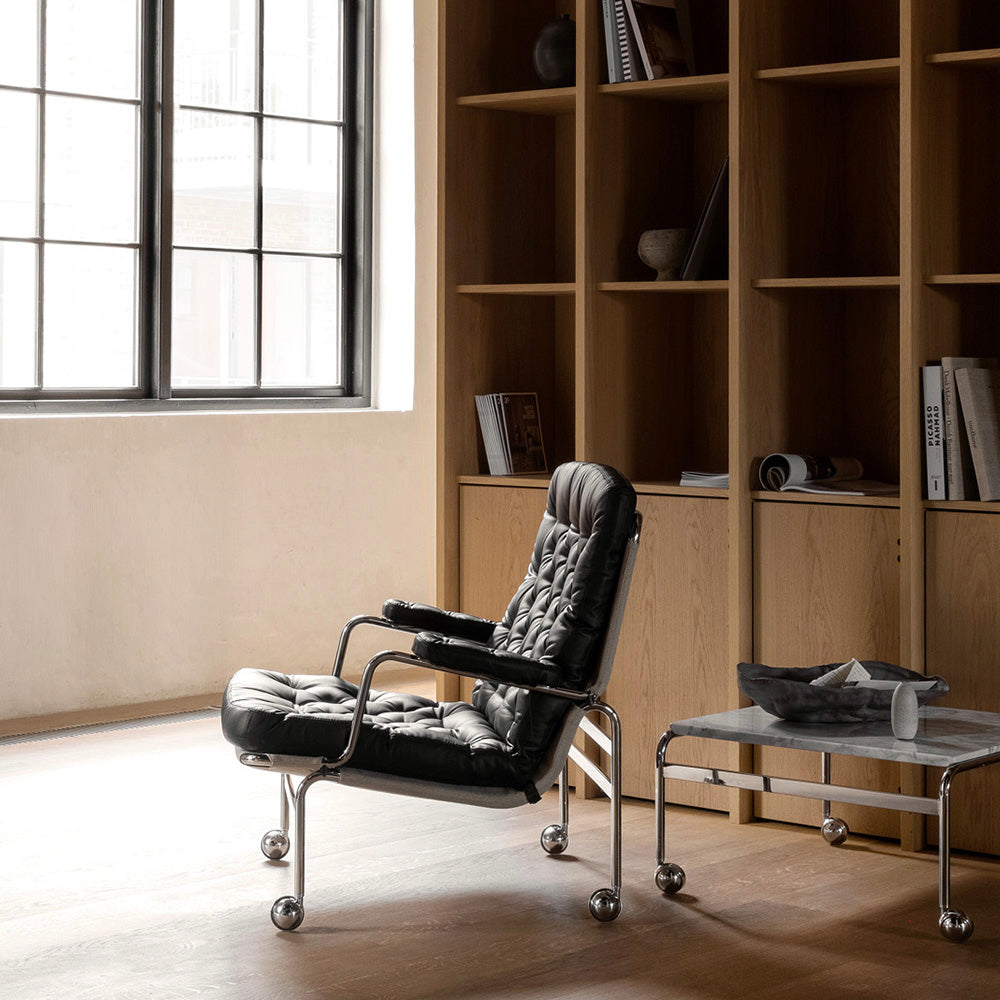 En klassisk og elegant lenestol designet av Bruno Mathsson. Karin 73 er nett med ramme i fint krom og puter med dype sømmer.